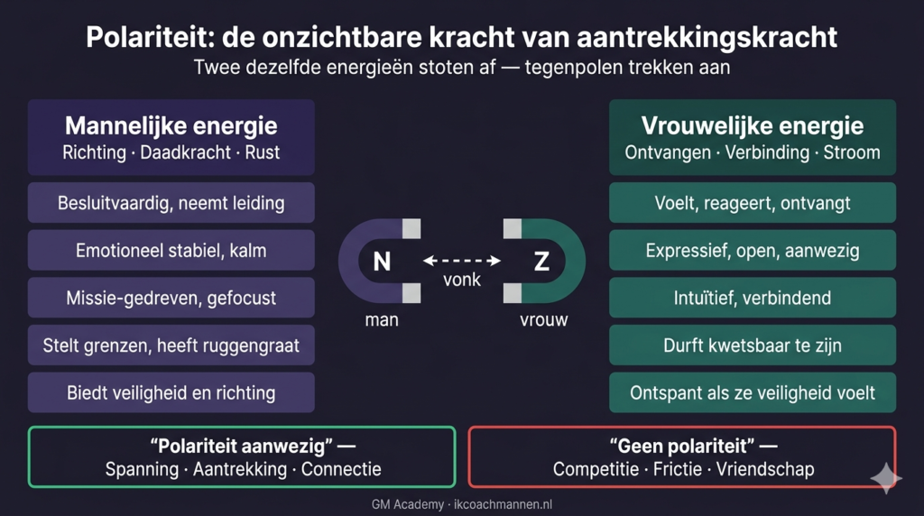 Aantrekkingskracht is geen checklist die je afvinkt. Het is pure energie. Denk aan een magneet. Twee dezelfde polen stoten elkaar af, tegenpolen trekken elkaar aan. In relaties heet dit polariteit. De spanning tussen mannelijke en vrouwelijke energie. Dit is de onzichtbare kracht die zorgt voor passie, verlangen en de spreekwoordelijke ‘vonk’.
